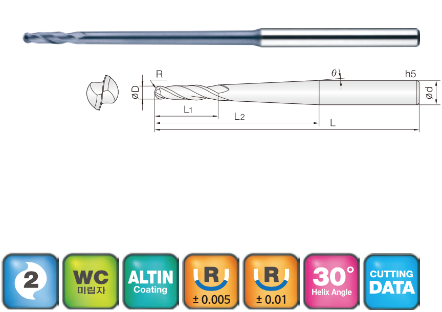 Endmill for various work materials, graphite, hardenedsteel (HRc~48), pre-hardened steel, tool steel and cast iron
