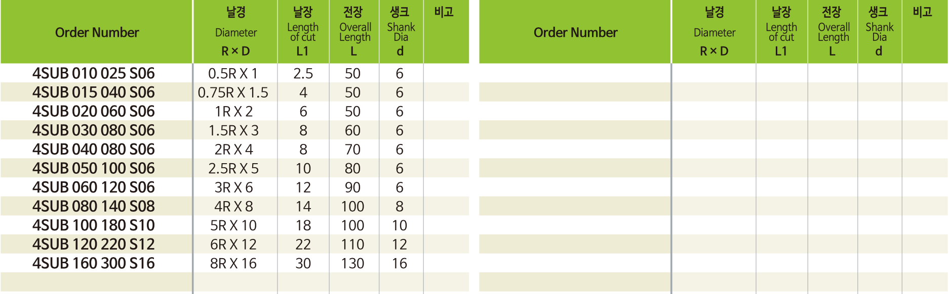 • Excellent work surface finish by 4 flute and deep chip pocket.Minimize fracturing at high feed by high TRS fine WC grade.